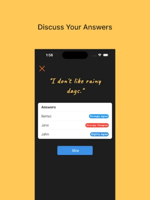 Once the game starts, players will be prompted with a statement and must rate it as agree or disagree. After everyone has made their choice, the group can discuss and see how everyone's answers compare.