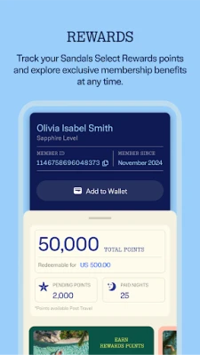 - Access your Sandals Select Rewards — See your member level, track nights to your next tier, and view your ID and point balance—anytime, anywhere.