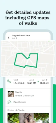 • Get a map of your dog's walk, pee/poo and food/water alerts, and a personalized note from your sitter or dog walker.
